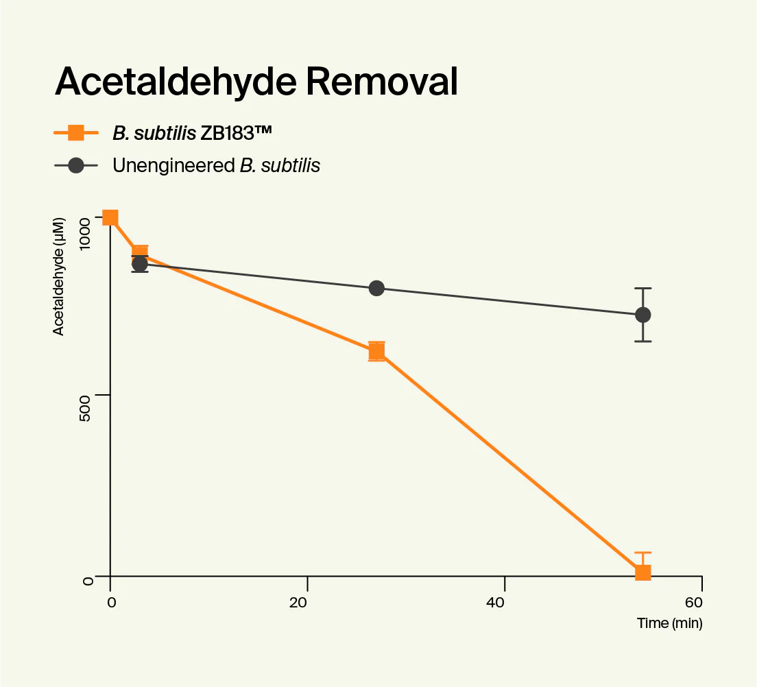 This probiotic – Bacillus subtilis ZB183™ – has been engineered to produce the same type of enzyme as our liver: one that digests acetaldehyde.